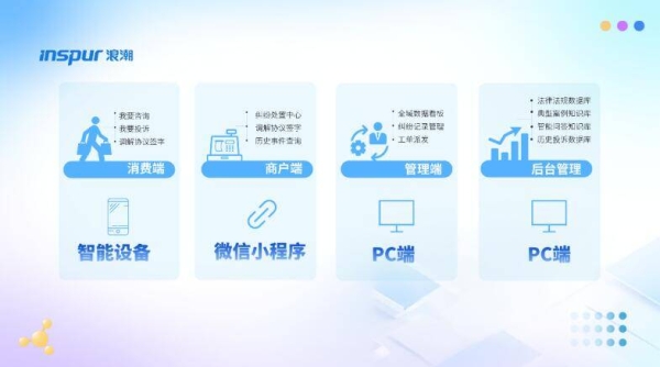 浪潮智能维权机器人设计以用户需求为导向,构建了管理端、消费端、商户端三位一体的服务网络,实现了维权流程的全场景覆盖。