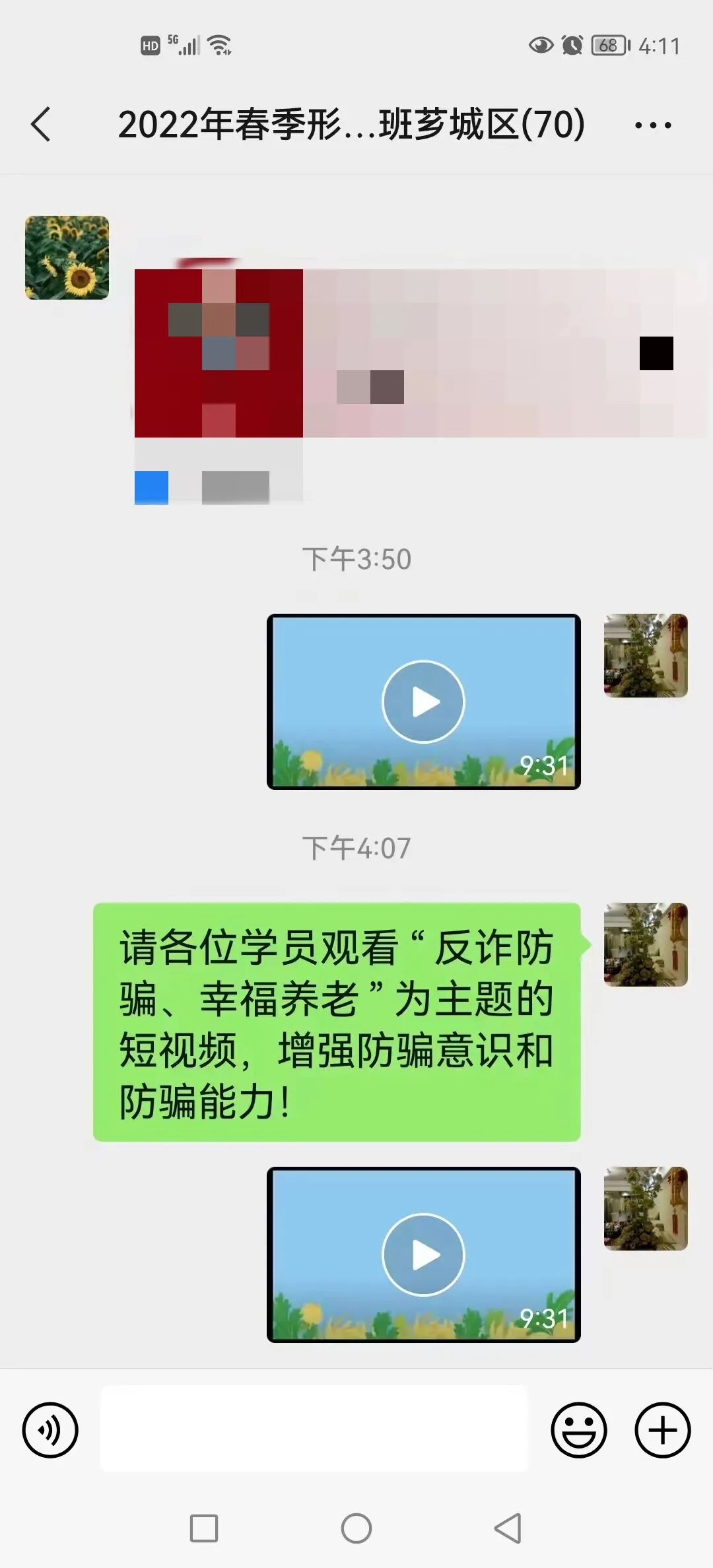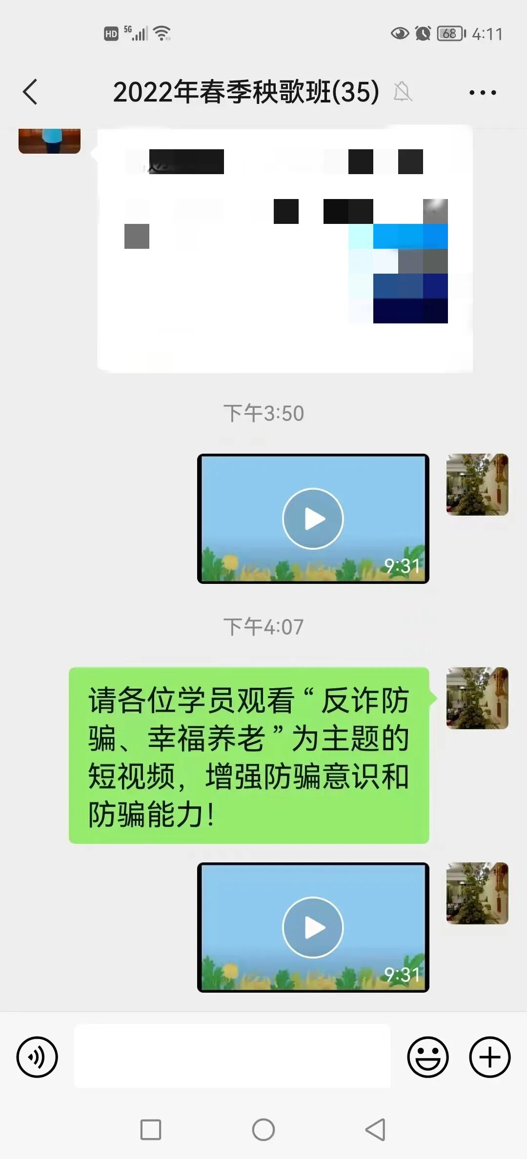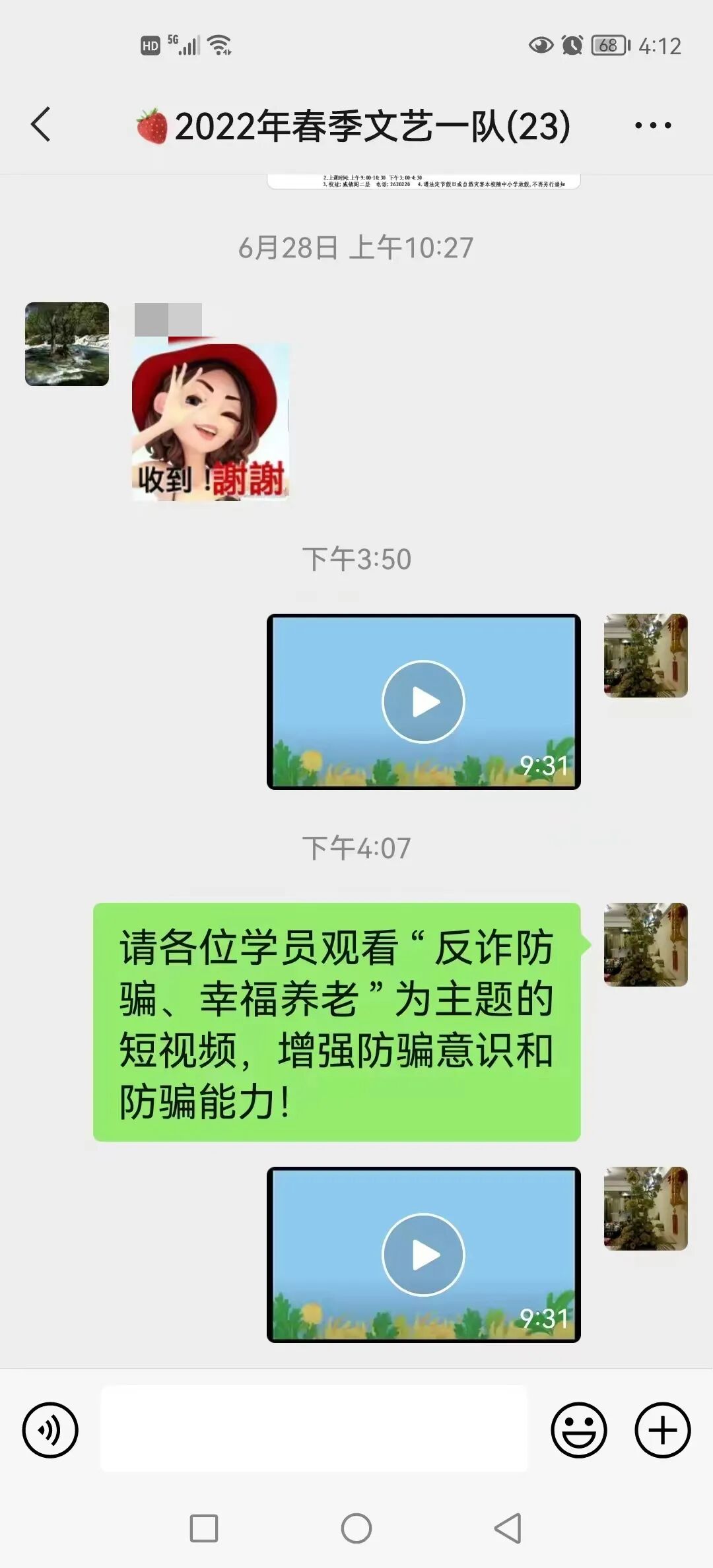 这几天,芗城区老年大学的微信群里特别热闹,芗城法院联系老年大学工作人员,将防范养老诈骗宣传小视频和《芗城法院打击整治养老诈骗宣传手册》电子版在老年大学的各类班级群广为转发,取得极佳的宣传效果。