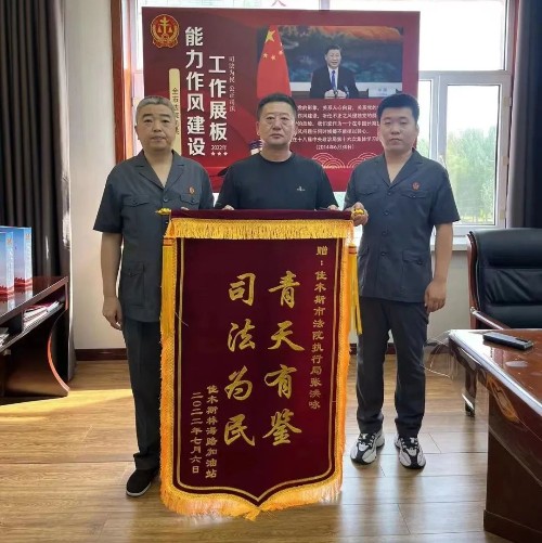 近日,佳木斯中院一起涉党政机关案件申请执行人将一面写有“青天有鉴 司法为民”的锦旗交到执行干警手中,短短几字,体现了执行干警执法为民的司法理念,饱含了人民群众对佳木斯中院执行干警工作的肯定和赞扬。