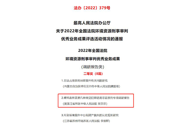 近日,最高人民法院办公厅通报2022年全国法院环境资源刑事审判优秀业务成果评选活动情况,林区中院吴莎莎同志撰写的《破坏森林资源几种常见犯罪适用非监禁刑专项调研报告》获得调研报告类二等奖。