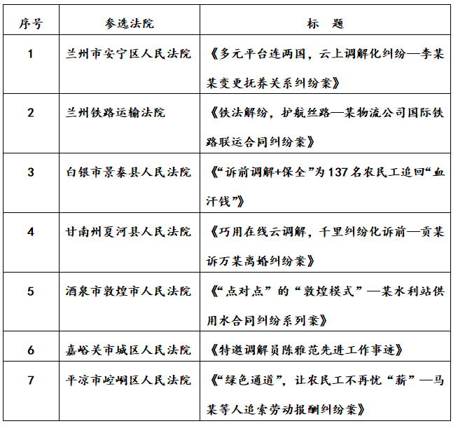 为发挥典型经验和优秀案例的示范、引领作用,更加生动地讲好全省法院立案诉服部门助力优化法治化营商环境故事、展现一站式建设工作成果、推动“人人都是营商环境、事事都关营商环境、案案都涉营商环境”落地落实,经全省三级法院自行申报,省法院立案一庭、宣传处及网络处综合审查评选,同时结合参评法院一站式建设质效评估得分及社会公众网络投票结果,坚持“优中选优”,确定将兰州市城关区人民法院等12家法院的经验做法及兰州市安宁区人民法院等7家法院的案例作为全省法院助力优化营商环境暨一站式多元纠纷解决和诉讼服务体系建设典型经验和优秀案例向社会发布,具体名单如下: