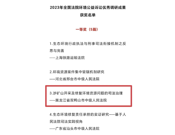 近日,最高人民法院办公厅通报2023年全国法院环境公益诉讼审判优秀业务成果评选情况,我省双鸭山中院报送的《涉矿山开采及修复环境资源问题的司法治理》获得优秀调研成果一等奖。