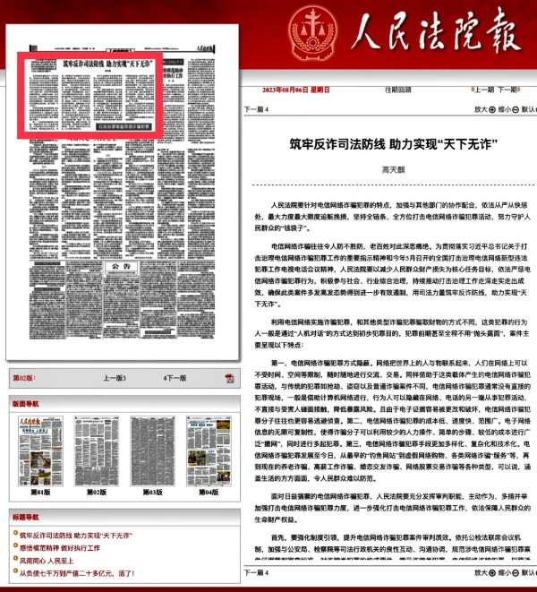 2023年8月6日,《人民法院报》刊发了鹤岗市工农区人民法院的文章:筑牢反诈司法防线 助力实现“天下无诈”。