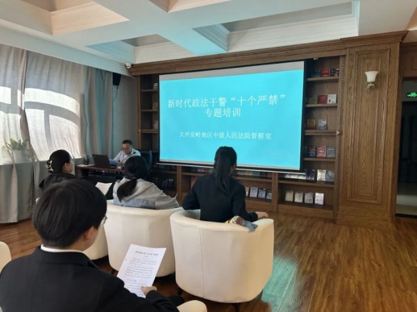 督察室侯丽超从十个严禁”的出台背景、制定依据、四大亮点等方面进行了授课。结合2023年大兴安岭地区法院典型案例,进行深入细致的讲解,会上观看了“十个严禁”内容宣传短片。