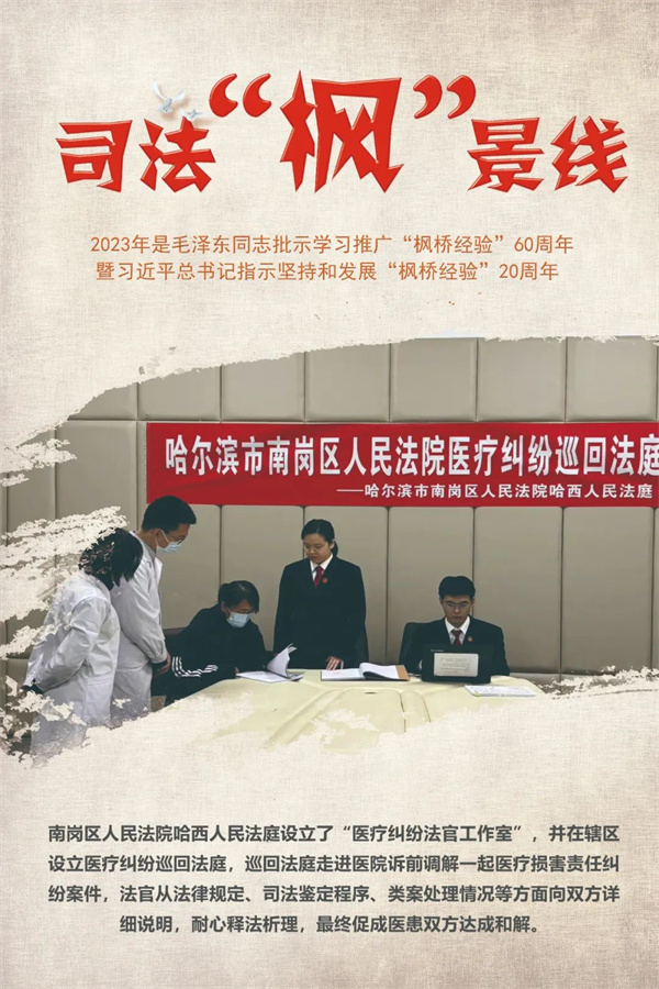 11月16日,最高人民法院召开“枫桥式人民法庭”创建示范项目动员部署会,提出人民法院要做深新时代“枫桥经验”,切实提升矛盾纠纷预防化解法治化水平。哈尔滨法院按照省法院“一要二统三抓实”工作思路,加快构建“四化四解四到位”诉源治理新格局,积极践行新时代“枫桥经验”拓展新思路、探寻新办法,能动推进诉源治理作为审判体系的“神经末梢”与基层解纷“桥头堡”,人民法庭站在了推进社会治理和服务乡村振兴的最前沿。