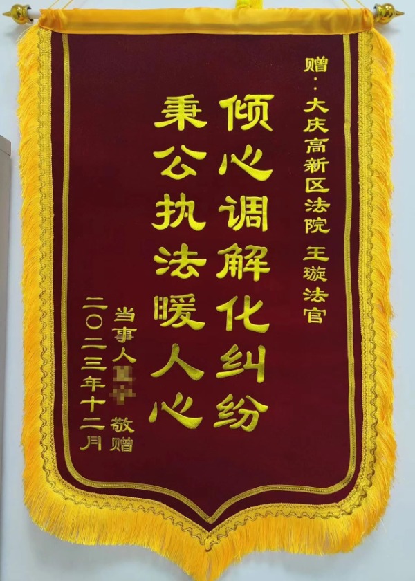 “感谢你们耐心与倾心的调解,被告已将培训费退还到我的银行账户。”近日,大庆市高新区法院诉讼服务中心速裁法官王璇收到当事人刘某寄来的一面印有“倾心调解化纠纷,秉公执法暖人心”的锦旗,以此表达她对法官认真负责、公平公正、热心为民化解纠纷的工作态度的感激之情。