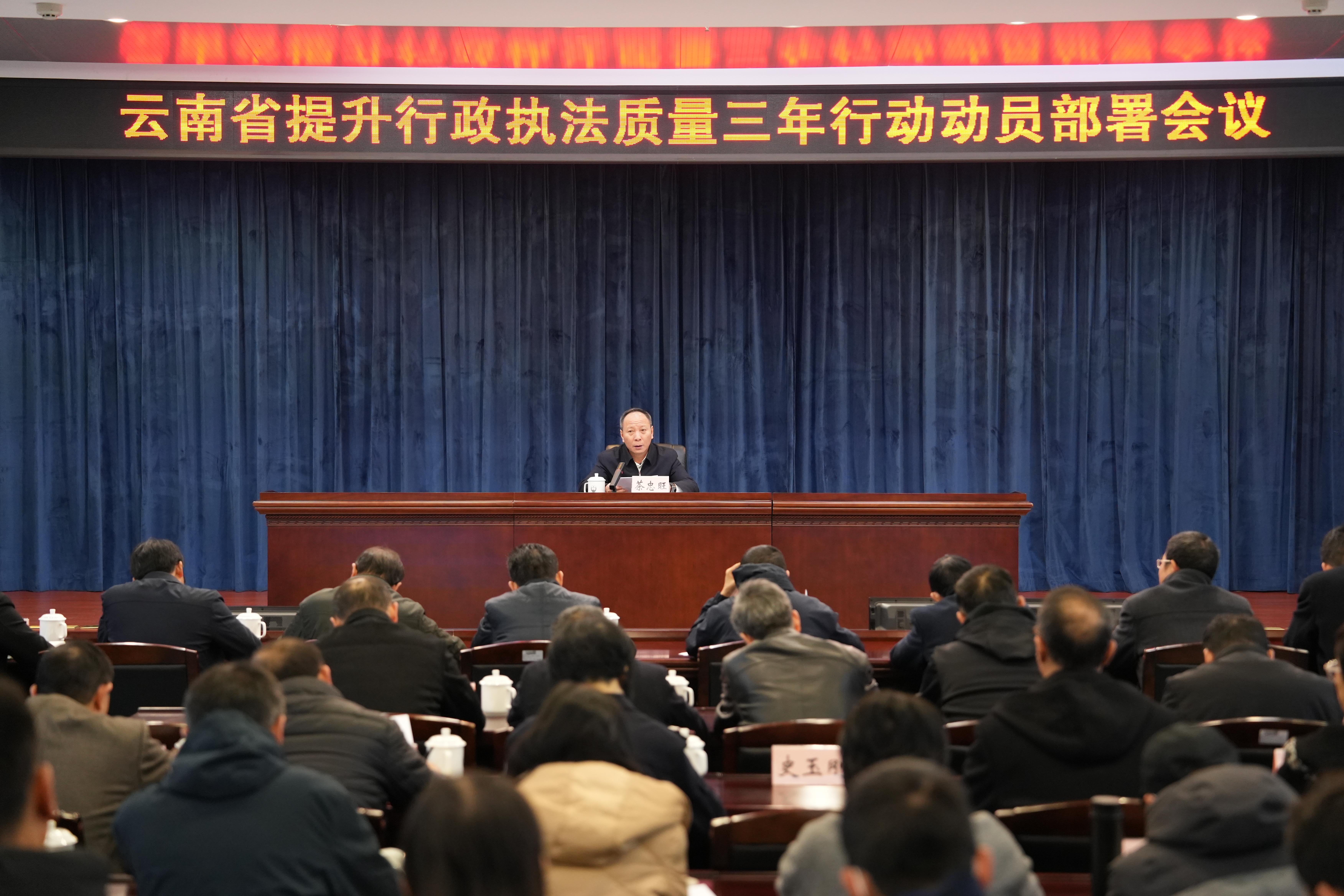 为贯彻落实《云南省人民政府办公厅关于印发云南省提升行政执法质量三年行动实施方案(2023—2025年)的通知》(云政办发〔2023〕63号,以下简称《实施方案》)要求,动员全省各级行政执法机关深入开展提升行政执法质量三年行动,全面提升我省行政执法质量和效能,进一步优化营商环境,保护企业和群众合法权益,12月28日,省委全面依法治省委员会执法协调小组召开云南省提升行政执法质量三年行动动员部署会议。主会场设在省司法厅,在各州、市、县、区司法局设分会场。省委全面依法治省委员会执法协调小组副组长、成员及联络员,省级行政执法部门分管领导和行政执法监督机构负责人,省委编办有关领导在主会场参会,各州、市、县、区党委全面依法治州、市、县、区执法协调小组组长、副组长、成员及联络员,各级行政执法部门分管领导和行政执法监督机构负责人在分会场参会。受省委全面依法治省委员会执法协调小组组长、副省长岳修虎委托,执法协调小组副组长、省司法厅厅长茶忠旺主持会议并讲话。