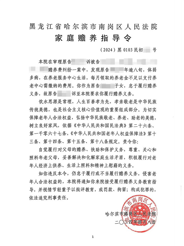 近日,哈尔滨市南岗区法院向一起赡养费纠纷案件中,怠于履行赡养义务的子女发出首份《家庭赡养指导令》。