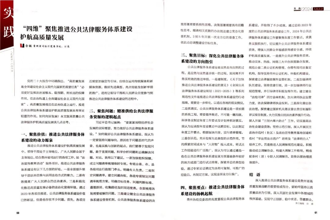 2024年3月,《人民法治》杂志(总第174期)刊发了贵州省司法厅党委书记、厅长余敏署名文章《“四维”聚焦推进公共法律服务体系建设护航高质量发展》,现予以全文转载。