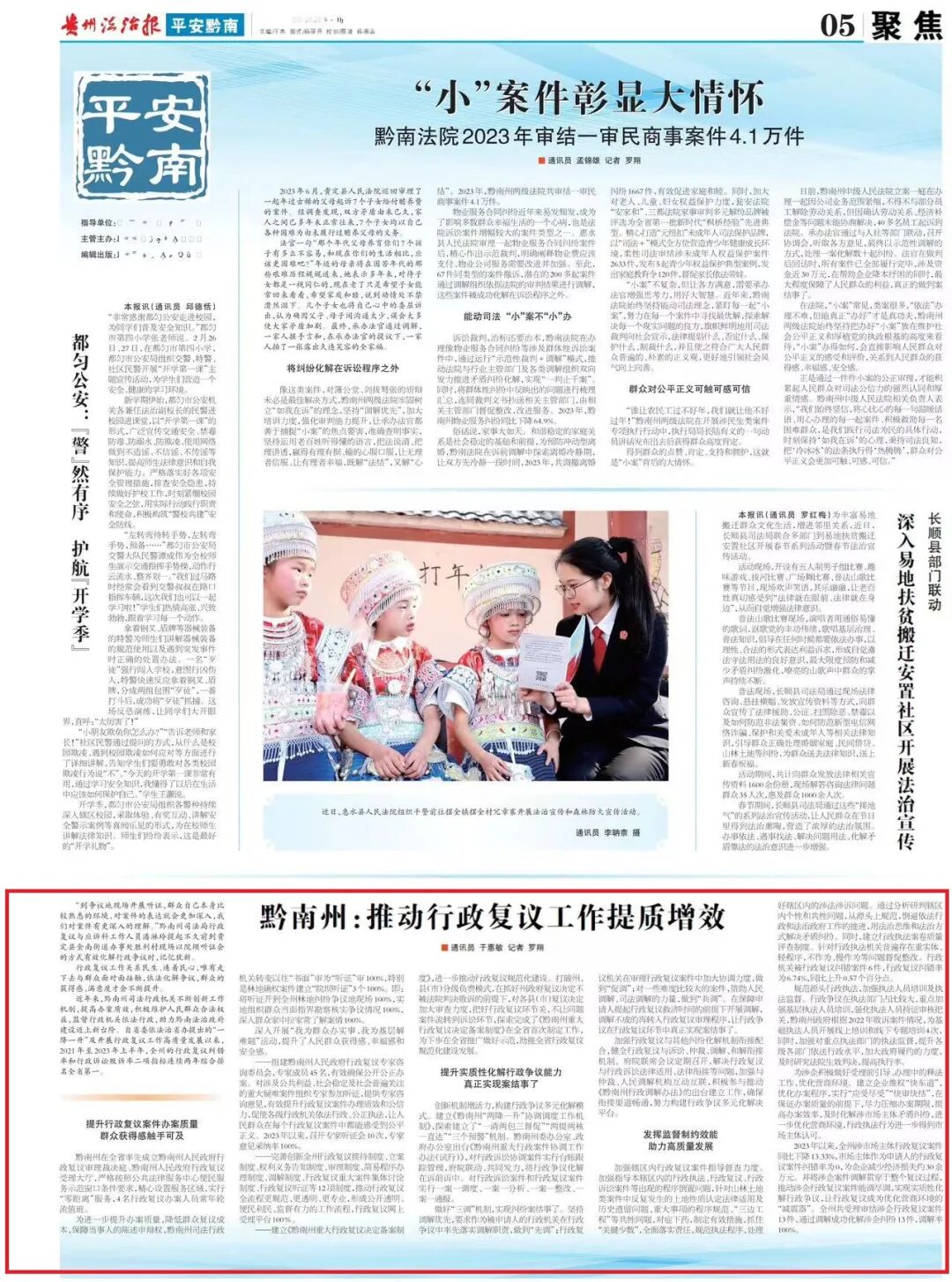 3月1日,《贵州法治报》刊发了《黔南州:推动行政复议工作提质增效》的文章。
