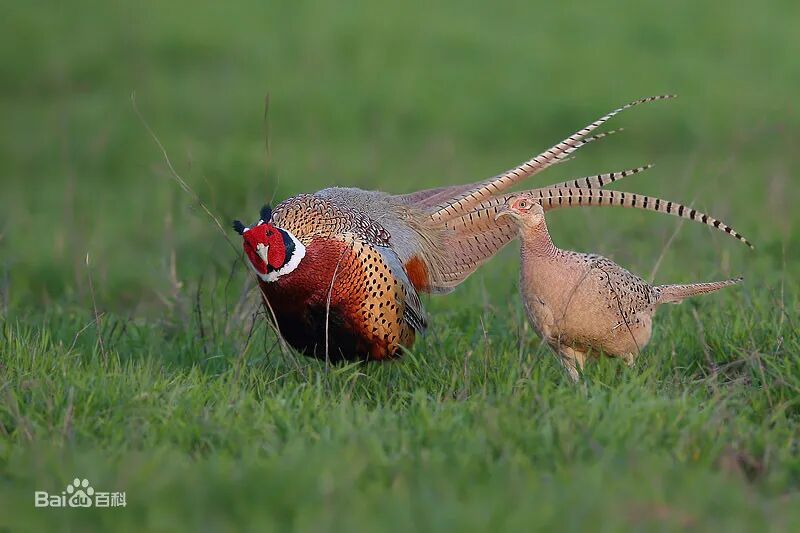 雉鸡(学名:Phasianus colchicus):鸟纲、雉科、雉属的一种走禽,共有30个亚种。体形较家鸡略小,但尾巴却长得多。雄鸟和雌鸟羽色不同,雄鸟羽色华丽,多具金属反光,头顶两侧各具有一束能耸立起而羽端呈方形的耳羽簇,下背和腰的羽毛边缘披散如发状;翅稍短圆;尾羽18枚,尾长而逐渐变尖,中央尾羽比外侧尾羽长得多,雄鸟尾羽羽缘分离如发状;雄鸟跗跖上有短而锐利的距,为格斗攻击的武器,近年来还发现距的长度与其所拥有的配偶数量明显相关,是雌鸟选择配偶的一个重要标准。