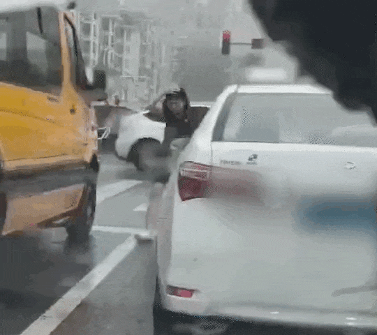 女司机举着伞冲上去